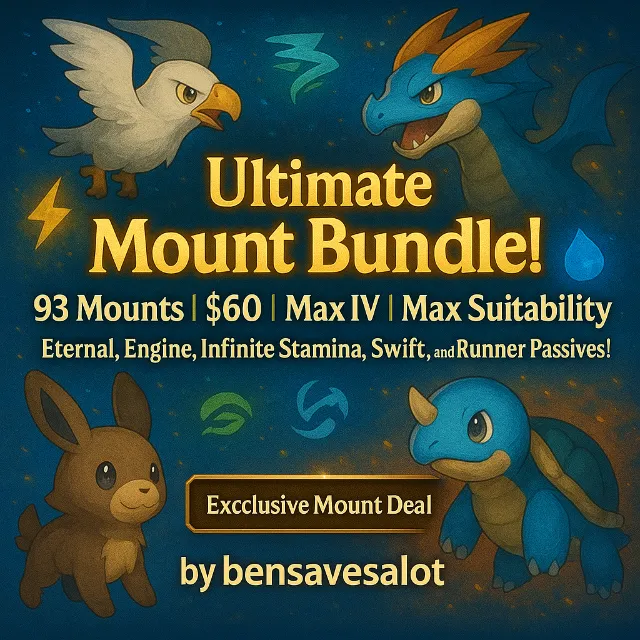 Dominate your Palworld adventure with this premium collection of 93 maxed mounts! Perfect for speed, stamina, and combat — every Pal in this bundle comes with: