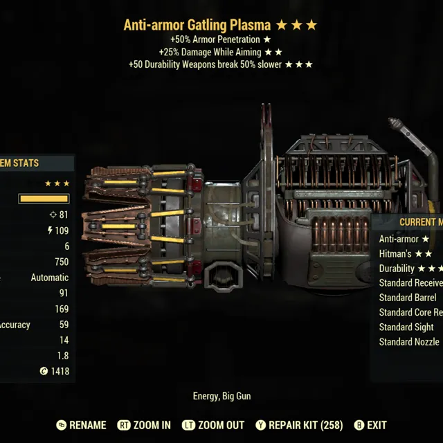 Type: Weapon. Anti armor, 25%,more aim damage / hitman’s, breaks 50% slower Gatling plasma. Max level