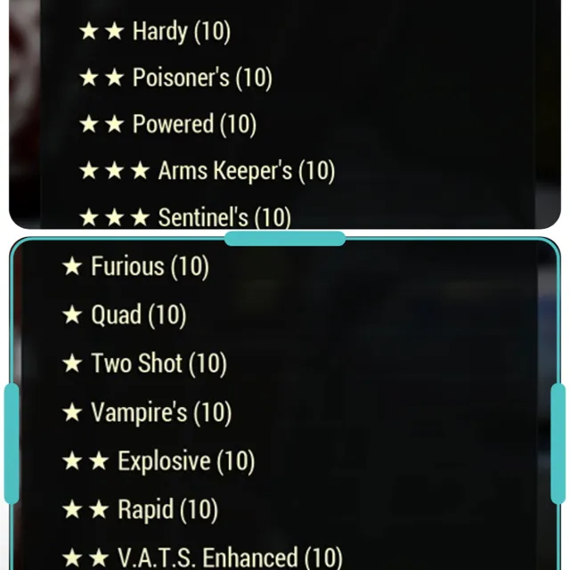 10 Anti armor, 10 Bloodied, 10 Furious, 10 Quad, 10 Two shot, 10 Vampires, 10 Explosive, 10 Rapid, 10 VATS Enhanced, 10 Vital, 10 Swift, 10 VATS Optimized, 10 Polished.