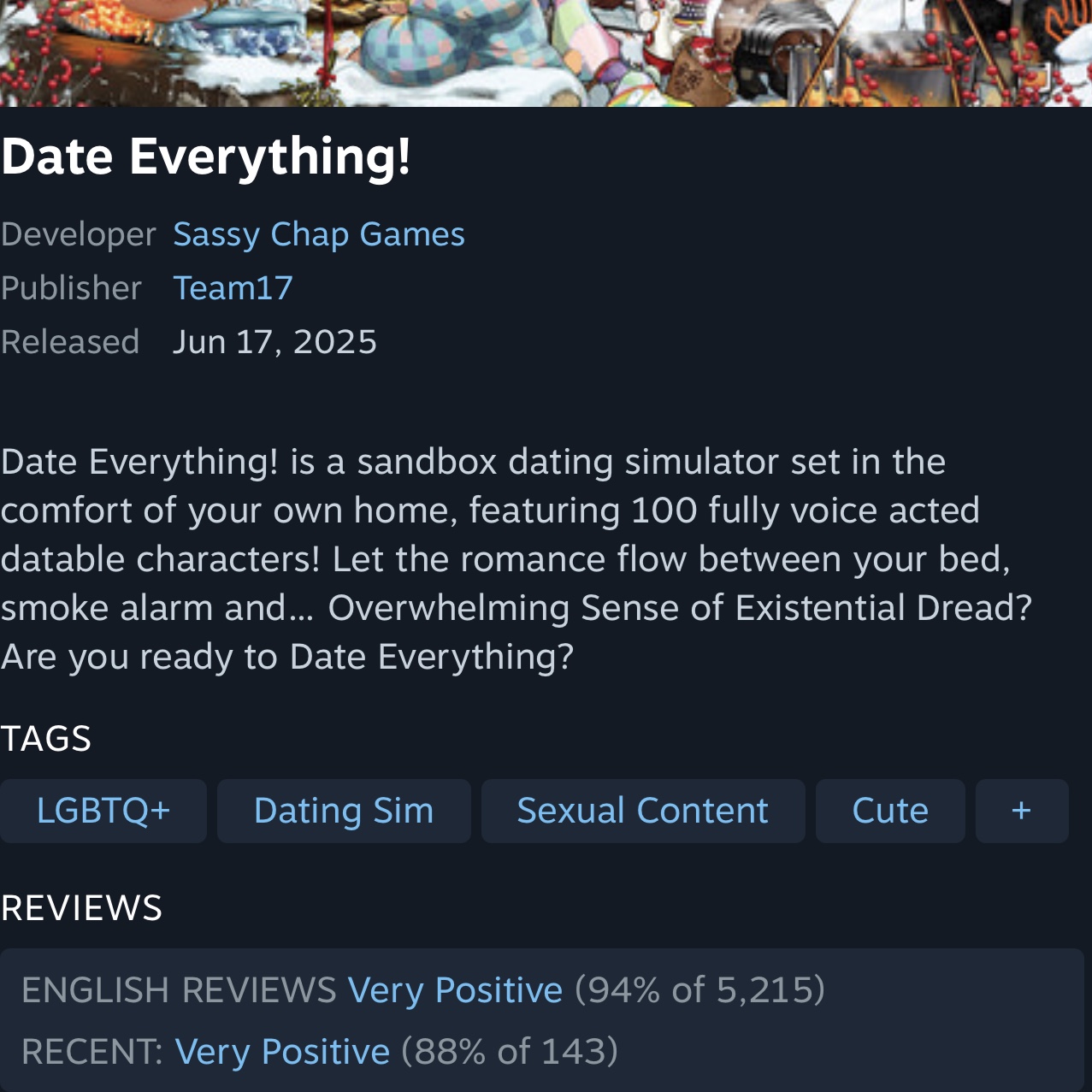 Date Everything! is a sandbox dating simulator set in the comfort of your own home, featuring 100 fully voice acted datable characters! Let the romance flow between your bed, smoke alarm and… Overwhelming Sense of Existential Dread? Are you ready to Date Everything?