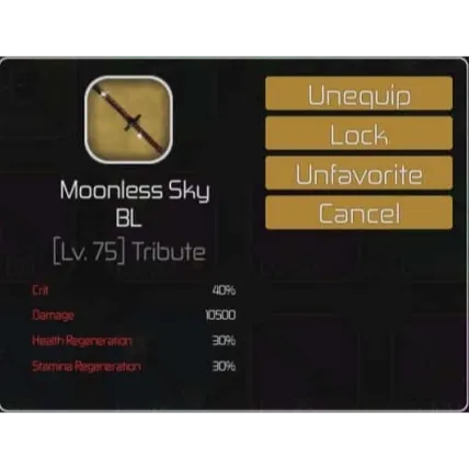 Moonless Sky – A rare Tribute katana from Blooming Plateau with 40% crit chance and strong regeneration buffs, making it one of the rarest and most sought-after weapons in Swordburst 2.