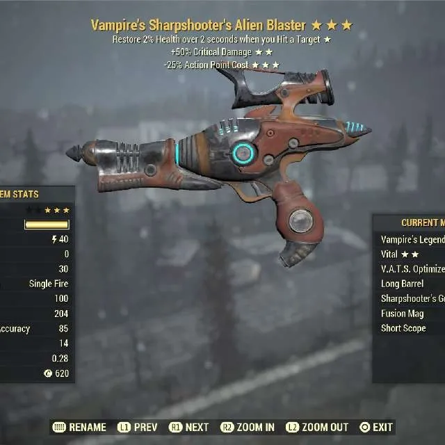 Vampire's 50 crit damage 25 less vats cost Alien Blaster Max Level
