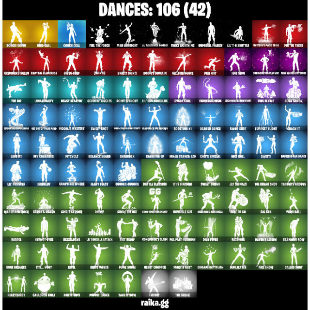• Outfits: 105 | Back Blings: 173 | Pickaxes: 134 | Dances/Emotes: 106