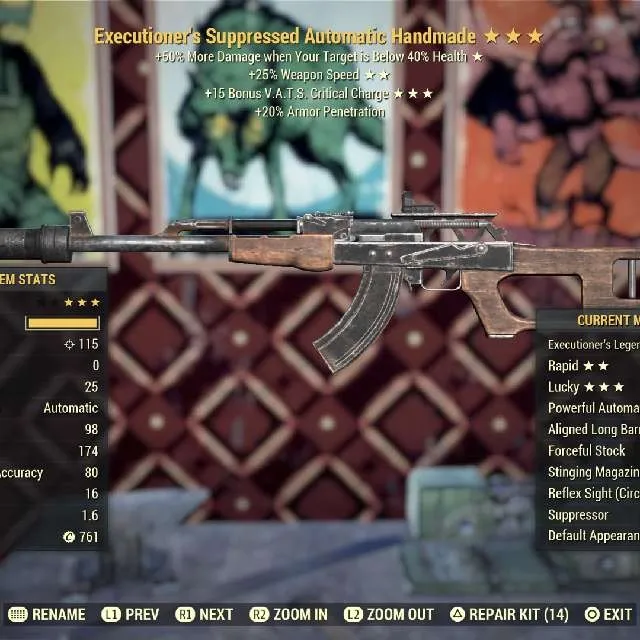 Executioner's faster fire rate 15 vats crit charge Handmade Max Level