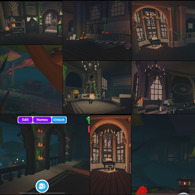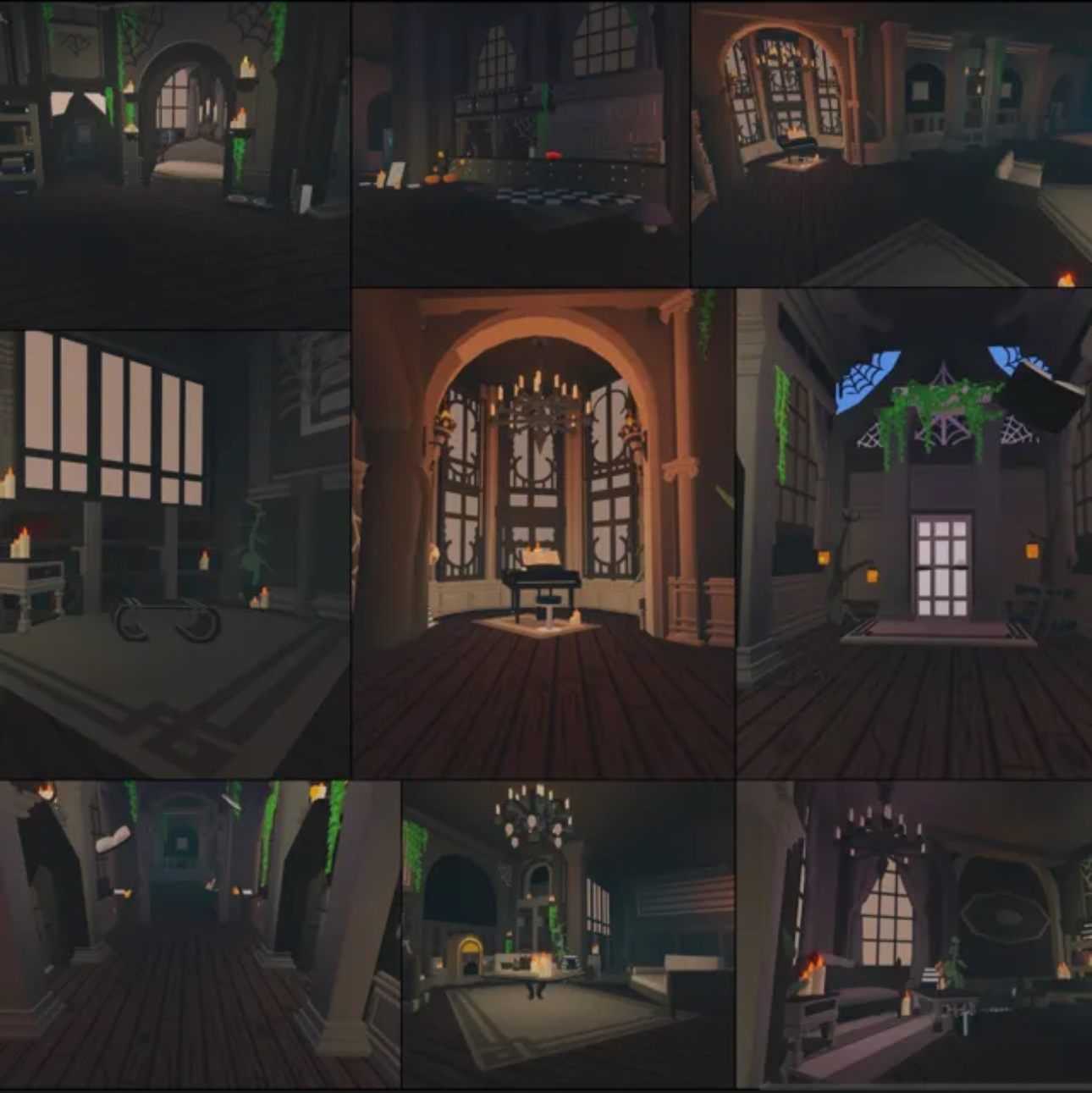 ✅ Gothic architecture with candles, chandeliers, vines, and cobweb touches for that Halloween aesthetic