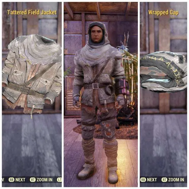 Tattered field jacket and wrapped cap
