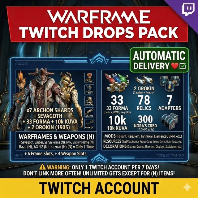 ✅ Warframes: Sevagoth, Ember, Saryn Prime (N), Nyx, Valkyr Prime (N) + 6 Warframe Slots.