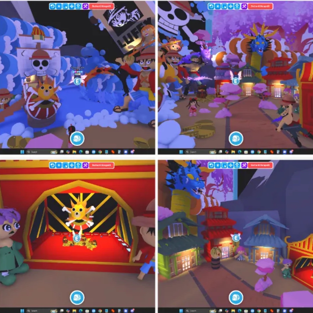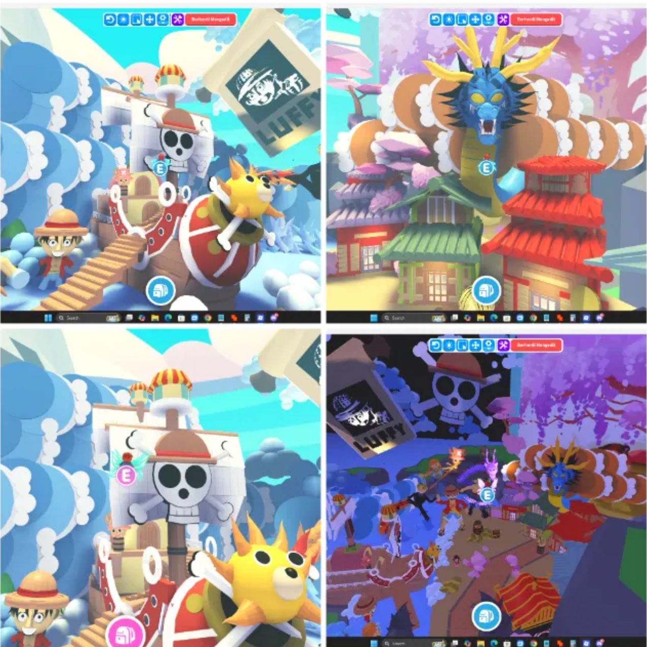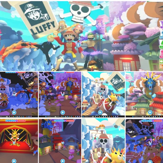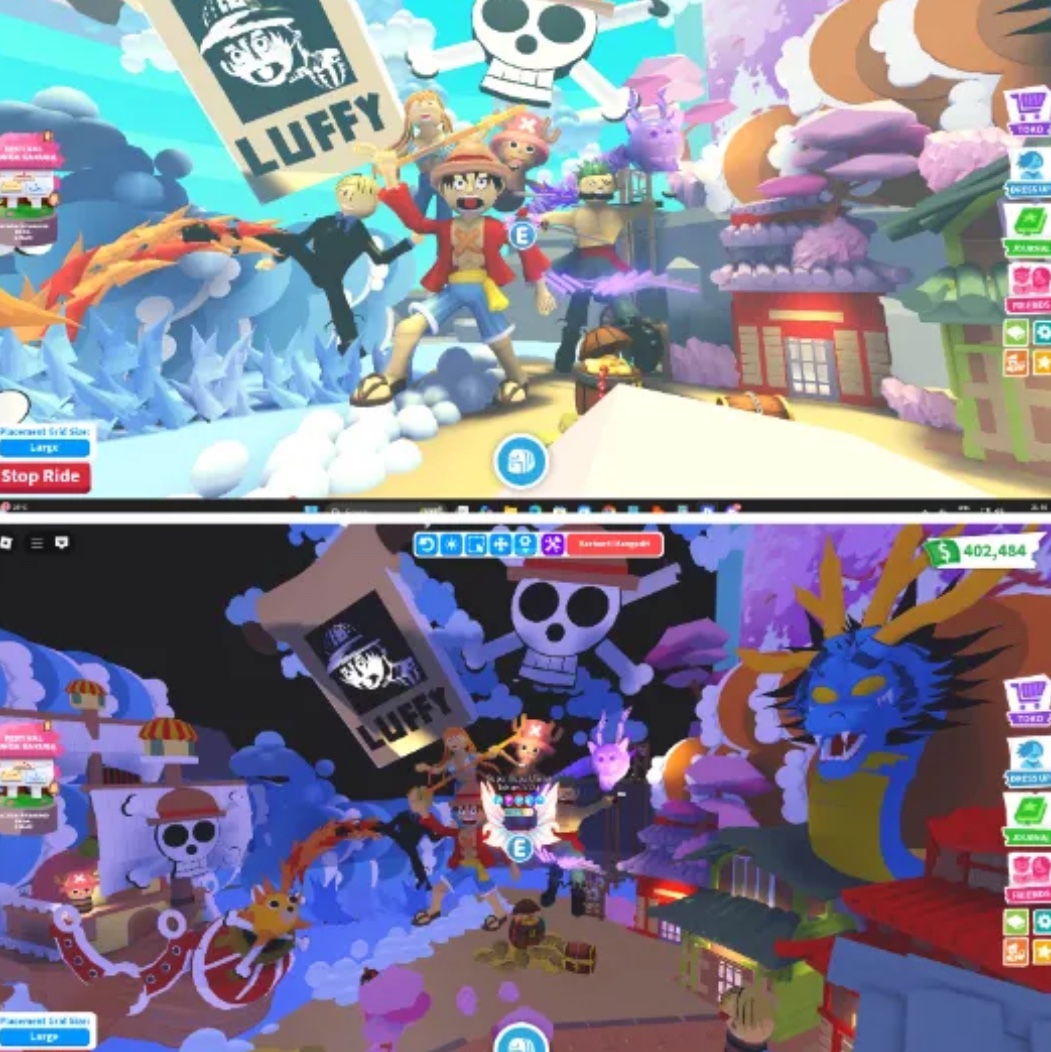 This is a huge custom Adopt Me home fully themed around One Piece, and it’s packed with detail from top to bottom. The whole place gives off that anime adventure vibe — with bright skies, dragons, ships, and characters inspired by the Straw Hat crew.