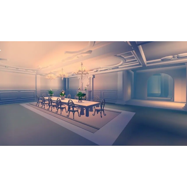 The interior features a decorated dining hall with chandeliers, elegant seating, and soft lighting—perfect for roleplay, hosting, or aesthetic screenshots. The remaining indoor rooms are left open and customizable, giving you complete freedom to design bedrooms, a kitchen, pet areas, or keep them empty for a clean, minimal look.