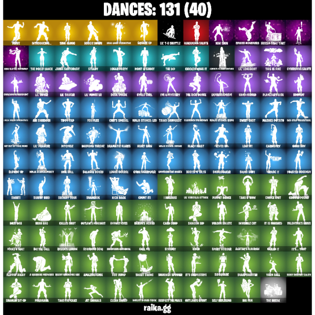 • Outfits: 157 | Back Blings: 198 | Pickaxes: 175 | Dances/Emotes: 131