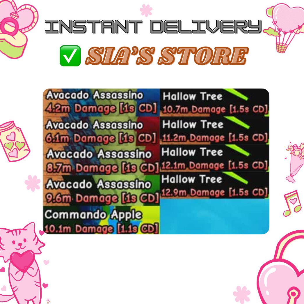 4x HALLOW TREE 10M- 12M DMG, 4x AVOCADO ASSASSINO 4M-9M DMG, 1x COMMANDO APPLE 10M DMG