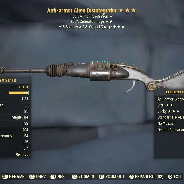Anti-armor 50 crit damage 15 crit charge Alien Disintegrator Max Level
