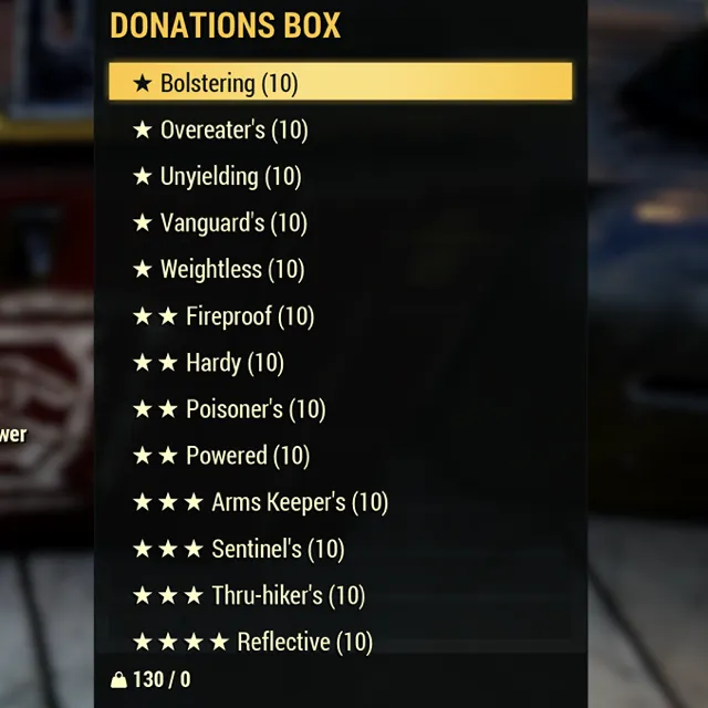 Fallout 76 Xbox one / Bundle includes the following 130 armor mods. Includes: 10 Bolstering, 10 Overeaters, 10 Unyielding, 10 Vanguards, 10 Weightless, 10 Fireproof, 10 Hardy, 10 Poisoners, 10 Powered, 10 Arms Keepers, 10 Sentinels, 10 Thru-hikers, 10 Reflective.