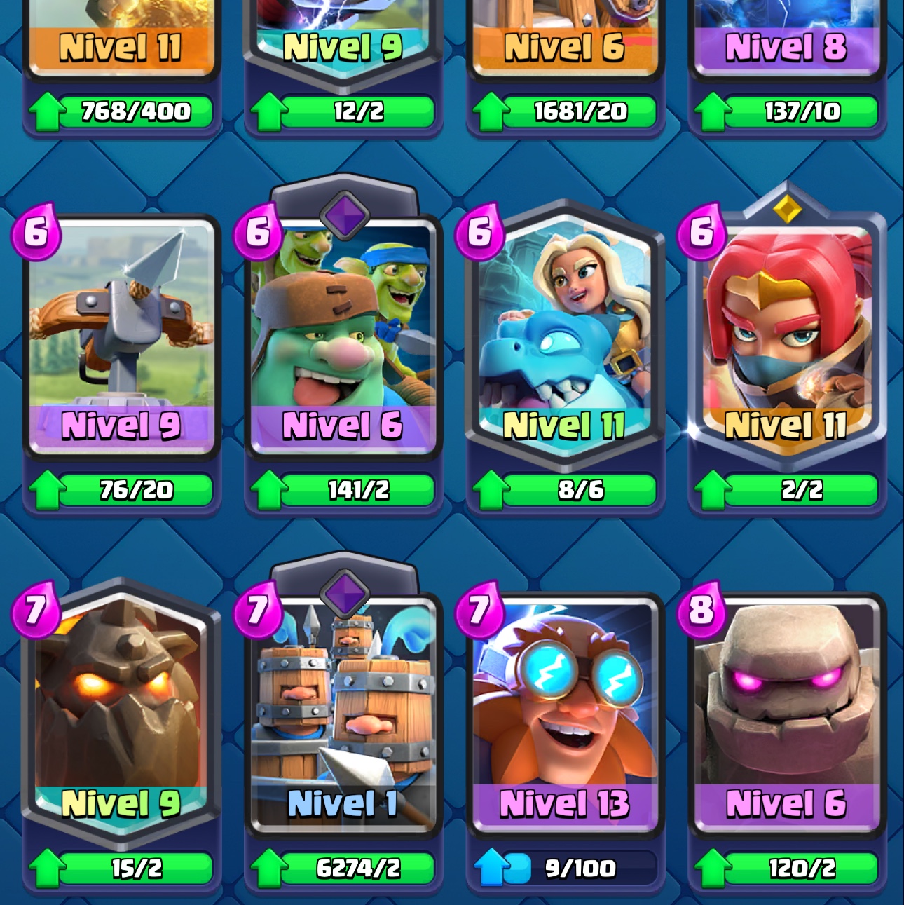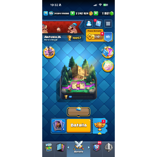 La cuenta es de nivel 56 y cuenta con más de 10.000 copas, posicionándose en un rango competitivo alto. Tiene todas las cartas desbloqueadas, lo que permite utilizar cualquier mazo del meta actual sin limitaciones. Varias cartas están a nivel 14 y 15, incluyendo cartas al nivel máximo 16, listas para competir al máximo nivel.