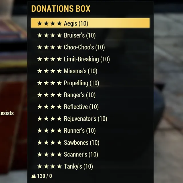 Fallout 76 Xbox one / Bundle includes 130 Four Star Armor Mods. Includes: 10 Aegis, 10 Bruisers, 10 Choo-Choos, 10 Limit-Breaking, 10 Miasmas, 10 Propelling, 10 Rangers, 10 Reflective, 10 Rejuvenators, 10 Runners, 10 Sawbones, 10 Scanners, 10 Tankys