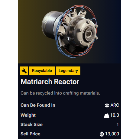 Matriarch Reactor is a Legendary item that can be found by scavenging destroyed Matriarchs.