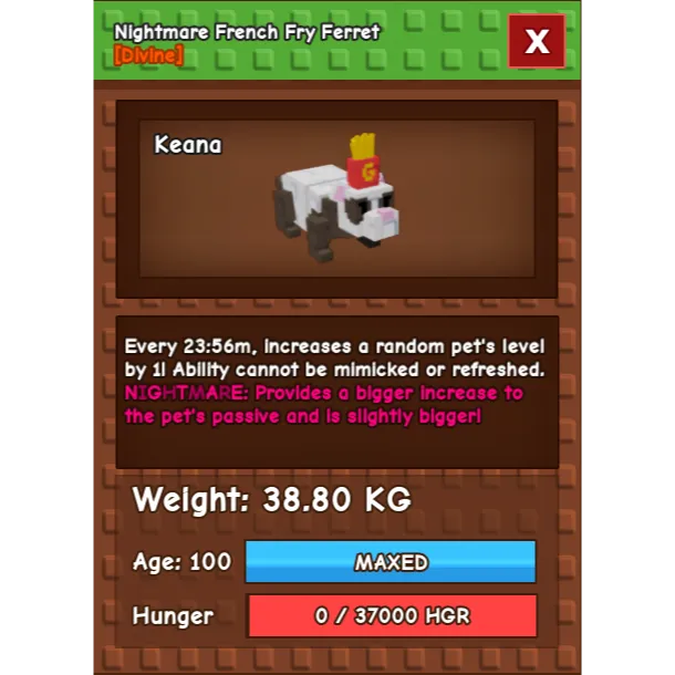 Ability : Every 24minute++, increase a random pet's level by 1 ! Ability cannot be mimicked or refreshed.
