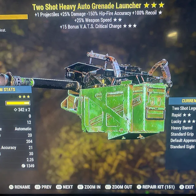 Type: Weapon. Two shot, weapon speed, 15% faster critical auto grenade launcher. Max level