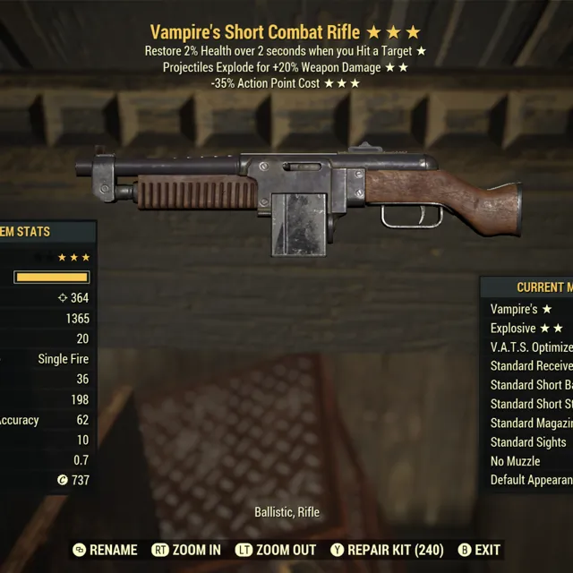 Type: Weapon. Vampires, explosive, vats optimized combat rifle. Max level