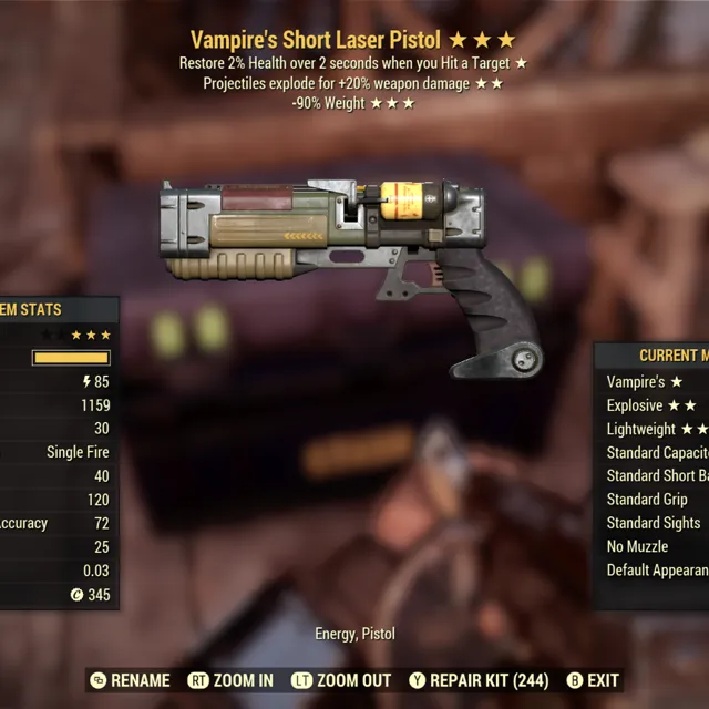 Type: Weapon. Vampires, explosive, 90% reduced weight laser pistol / rifle. Max level