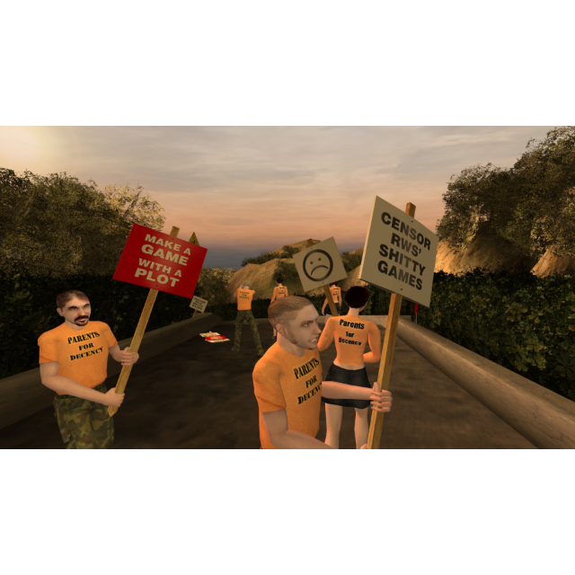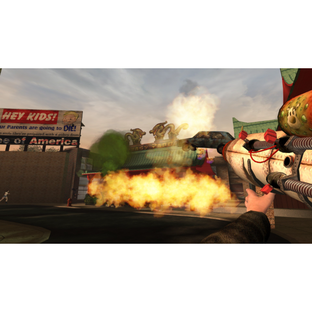 Blast, chop and piss your way through a freakshow of American caricatures in this darkly humorous first-person adventure. Meet Krotchy: the toy mascot gone bad, visit your Uncle Dave at his besieged religious cult compound and battle sewer-dwelling Taliban when you least expect them! Endure the sphincter-clenching challenge of cannibal rednecks, corrupt cops and berserker elephants. Accompanied by Champ, the Dude's semi-loyal pitbull, battle your way through open environments populated with amazingly unpredictable AI. Utilize an arsenal of weapons ranging from a humble shovel to a uniquely hilarious rocket launcher.