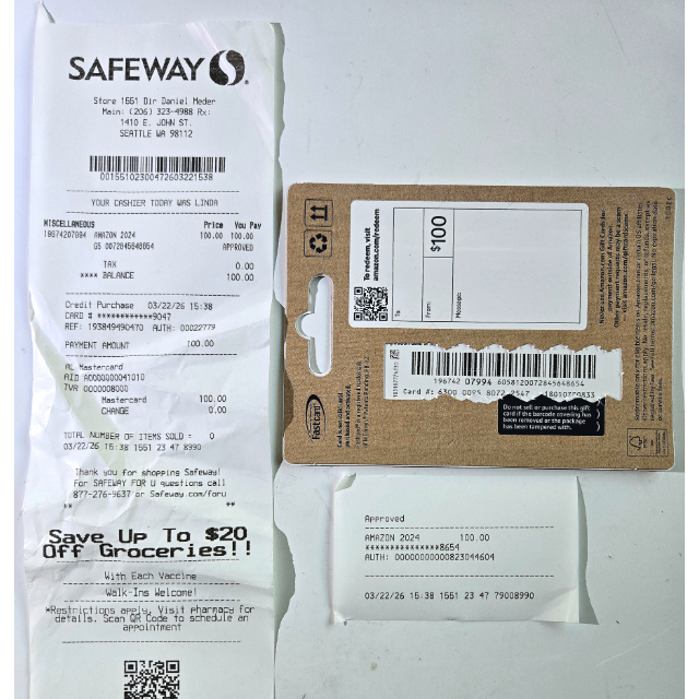 * This is a physical Amazon gift card purchased in-person at a retail grocery store. The code is loaded into Auto-Delivery for instant access.