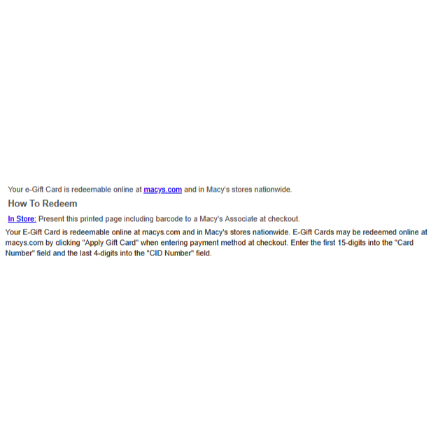 e-Gift Card is redeemable online at macys.com and in Macy's stores nationwide.