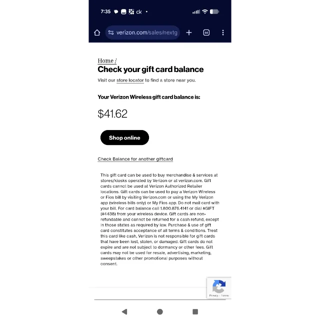 Verizon gift card for $41.62. only for use at Verizon