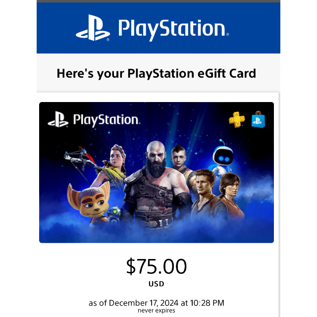 PlayStation Store E-gift Card, with a 75 USD balance, doesn’t expire.