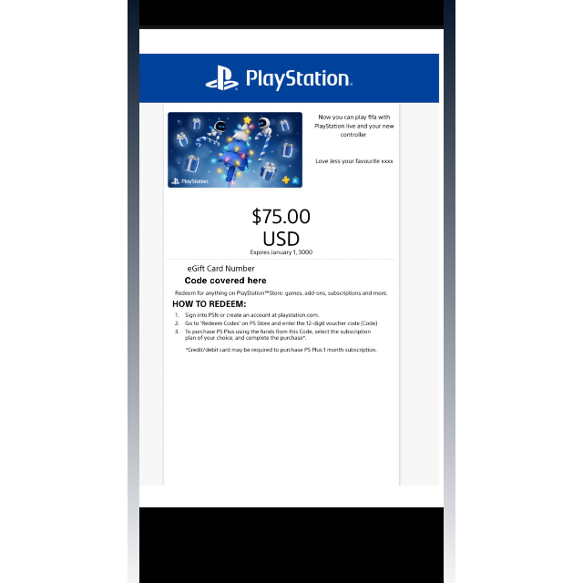 $75 PlayStation store gift card, bought as a gift for Christmas but can not be redeemed on my continent as I live in the UK.