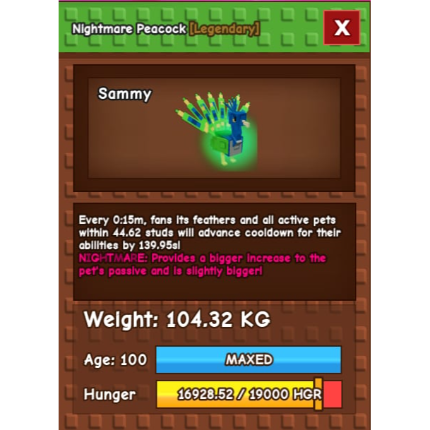 A true powerhouse for farming XP efficiently — get your Titanic Nightmare Peacock today and level up faster than ever!