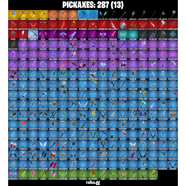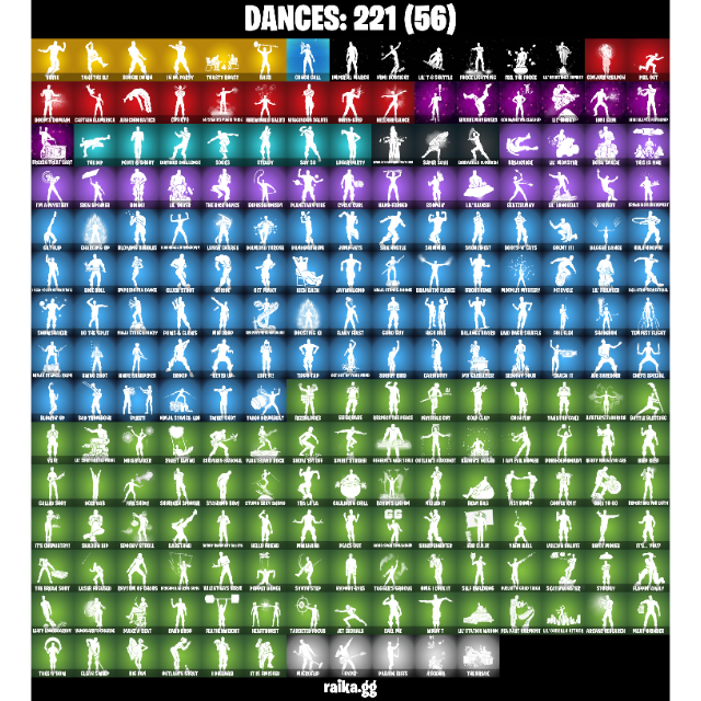 • Outfits: 256 | Back Blings: 327 | Pickaxes: 287 | Dances/Emotes: 221