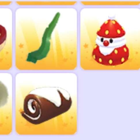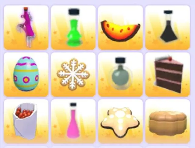 Includes ride a pet potion, grow potion, molten melon, anti gravity, patterns egg, snowflake cookie, big head potion, cake, cinnamon roasted almonds, speed potion, lebkuchen cookie, mooncake, seaweed, rice cake soup, sweet rice drink, yule log treat, taco, strawberry santa snack.