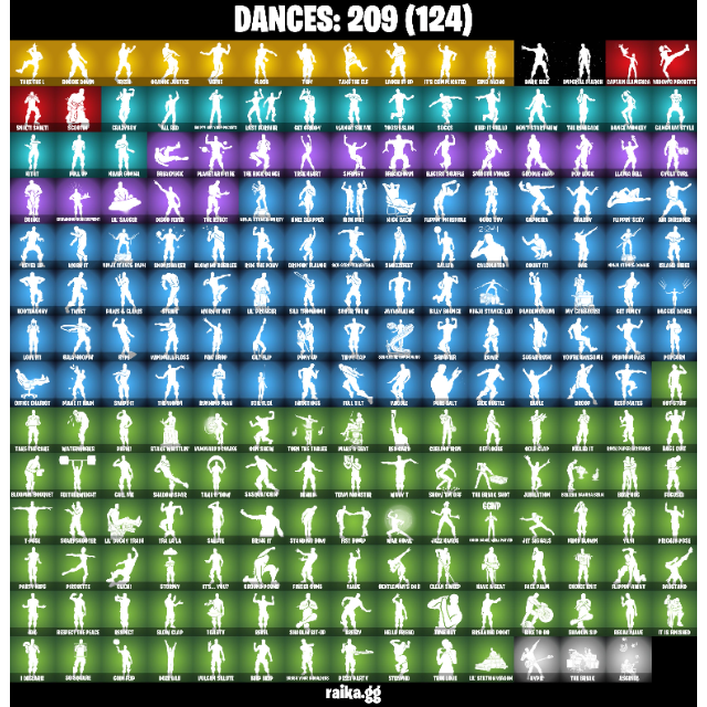 • Outfits: 193 | Back Blings: 228 | Pickaxes: 162 | Dances/Emotes: 209