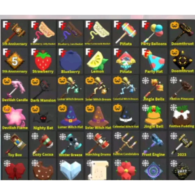 5th anniversary set, strawberry basket set, lemon basket set, blueberry basket set, pinata set, party balloons set, doomthrust set, devilish set, dark mansion set, lunar witch Broom Set, solar witch Broom Set, celestial witch Broom Set, jingle bells set, festive pinecone set, toybox set, cozy cocoa set, winter breeze set / cold hour set, marching drums set, Candelabra set, frost engine set,2023 set.