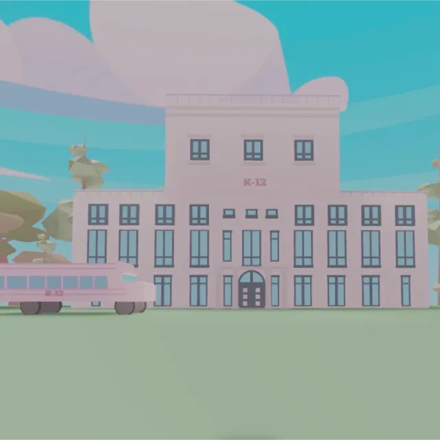 A dreamy pastel castle inspired by Melanie Martinez’s K-12, with soft pink tones and a whimsical, storybook feel. The building feels both magical and mysterious, like a fairytale school where fantasy and emotion blend together.