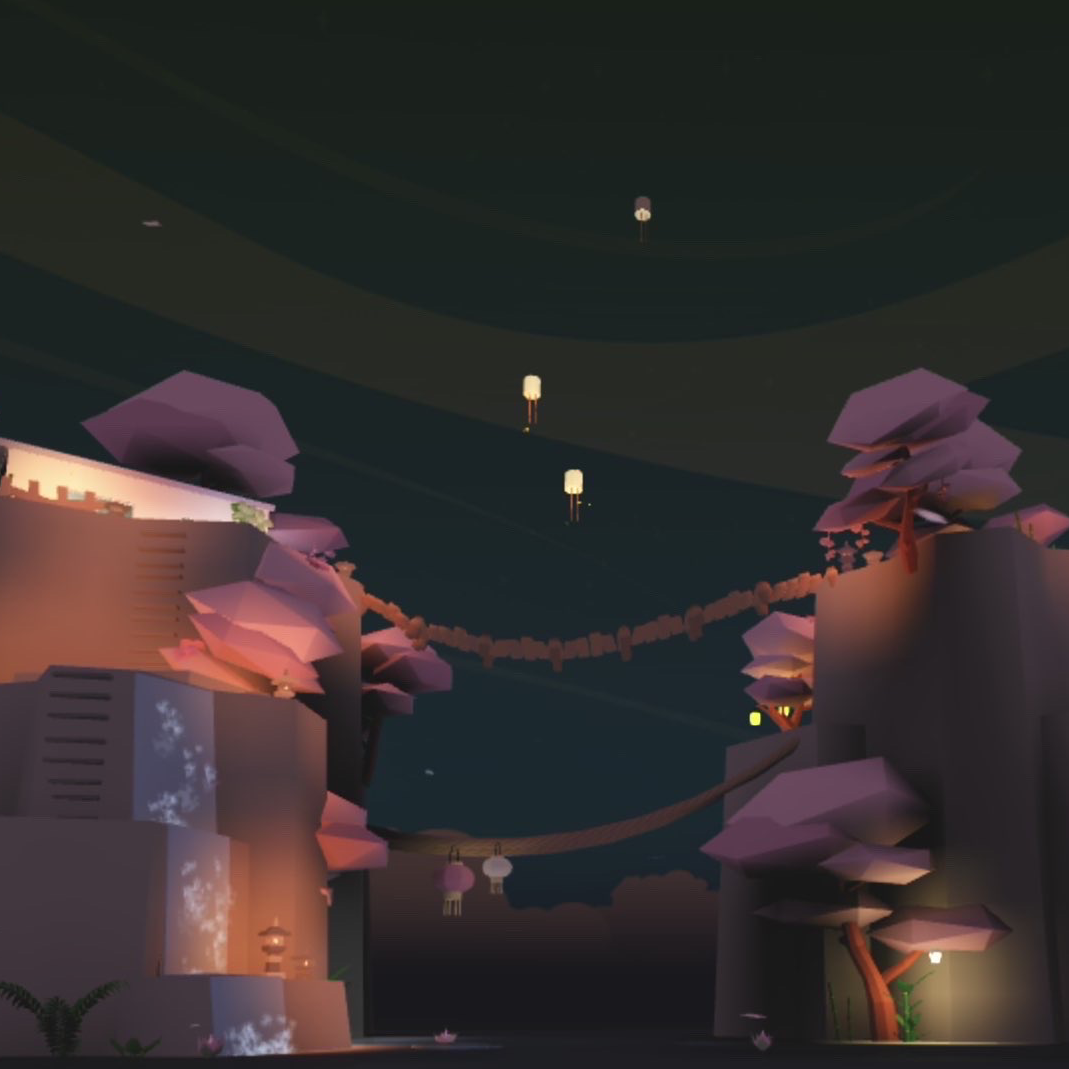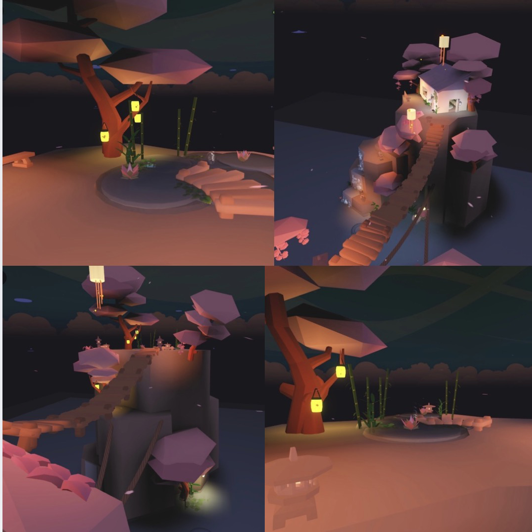 A small cozy house with soft pastel walls and a warm, welcoming feel. Large windows and simple natural details make it peaceful and inviting. Next to it, a quiet little lagoon adds a calm, relaxing atmosphere.
