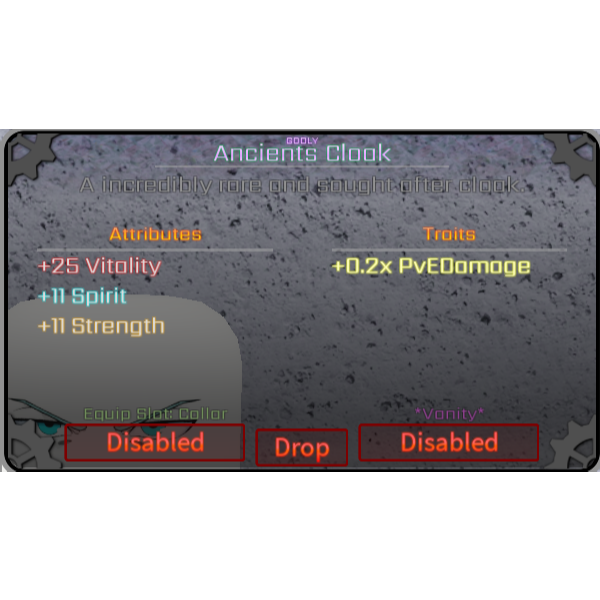 This item gives the player 25 Vitality, 11 Spirit, 11 Strength and 20% more PvE Damage