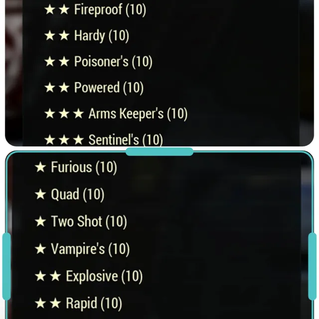 10 Anti armor, 10 Bloodied, 10 Furious, 10 Quad, 10 Two shot, 10 Vampires, 10 Explosive, 10 Rapid, 10 VATS Enhanced, 10 Vital, 10 Swift, 10 VATS Optimized, 10 Polished.