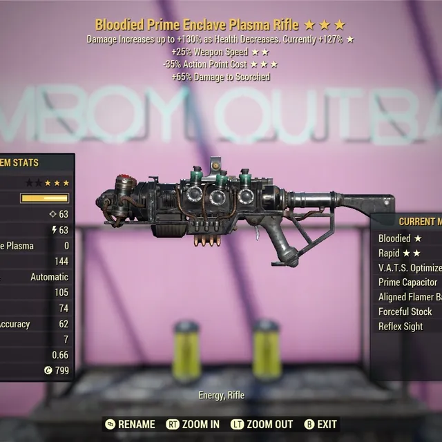 Bloodied 25 Faster Fire Rate Speed 35 Less Vats AP Cost Enclave Plasma Flamer