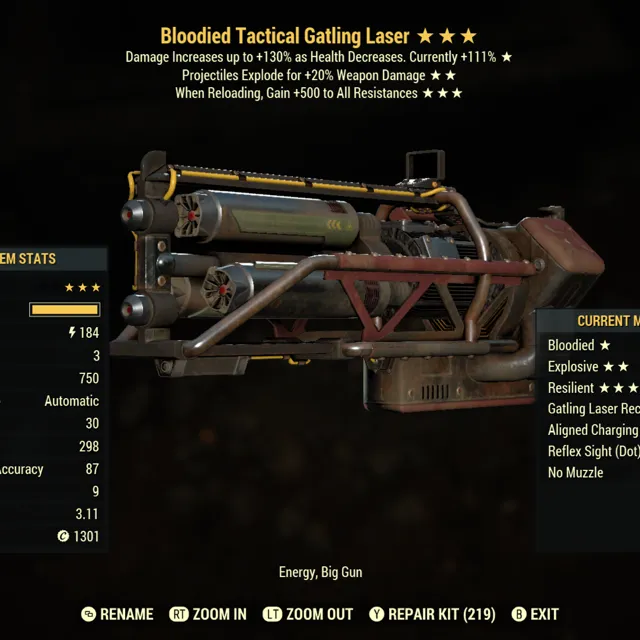 Type: Weapon. Blooded, explosive, 500 dr / resilient Gatling laser. Max level