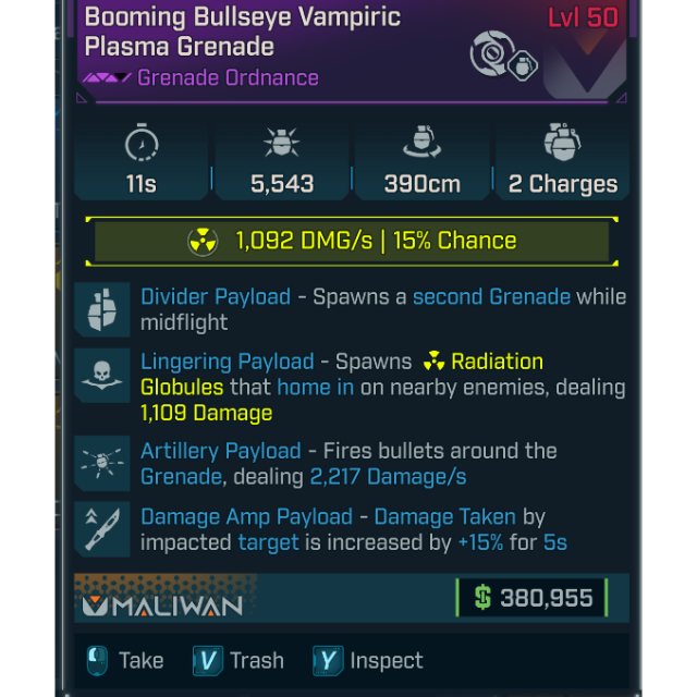 Borderlands 4 MODDED 12 PERKS ON IT! BOOMING BULLSEYE VAMPIRIC PLASMA GRENADE