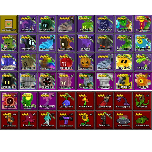 4× Saw O'Lantern, Silver Lawnmower, Star Fruit, Stickpetal,