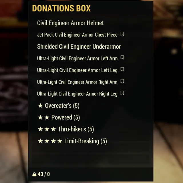 Fallout 76 Xbox one / Complete Civil Engineer armor set including a jetpack on the chest piece. Also includes a Shielded Civil Engineer Underarmor piece Each piece will be level 50, Buttressed, and Ultra Light Build or Deep Pocketed unless you request something different. Includes: