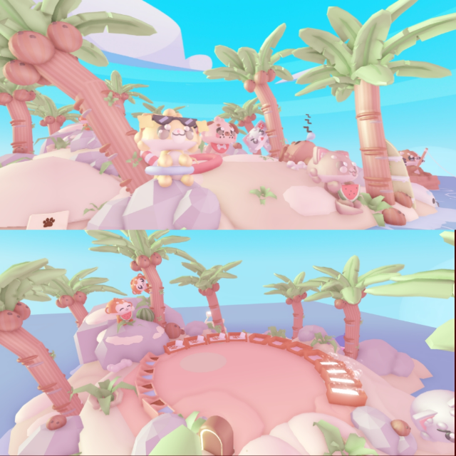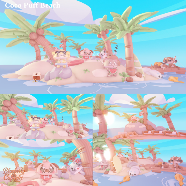 Welcome to a dreamy pastel paradise where the waves are soft and the coconuts sparkle in the sun! Coco Puff Beach is a cozy tropical getaway filled with adorable plushy animals enjoying a sunny island life.