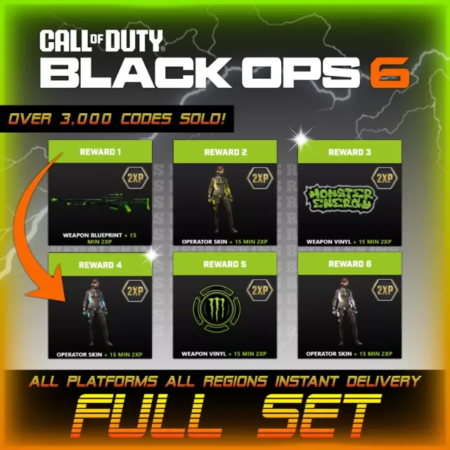 You will receive 6 codes for the full Monster Energy set for Call of Duty: Black Ops 6 for all platforms (Playstation 5, Playstation 4, Xbox Series X/S, Xbox One, PC Microsoft Store, PC Steam, PC Battle.net)