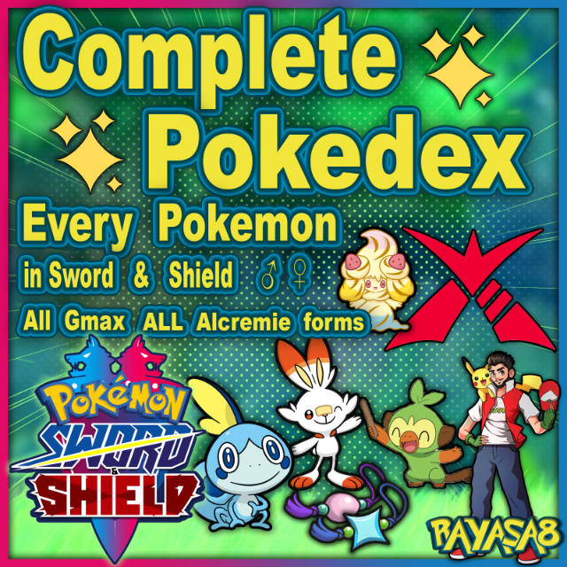 All Pokemons in Sword & Shield in one Bundle with this bundle you will complete Galar Pokedex, Isle of Armor Pokedex and Crown Tundra Pokedex including Legendaries + different forms like Alcremie, Gender forms + the transfer only Pokemons like Zeraora Magerna keldeo and more total of 855 pokemons 6iv EV trained Smogon Builds with the best natures ability and move sets for Battle for 99%