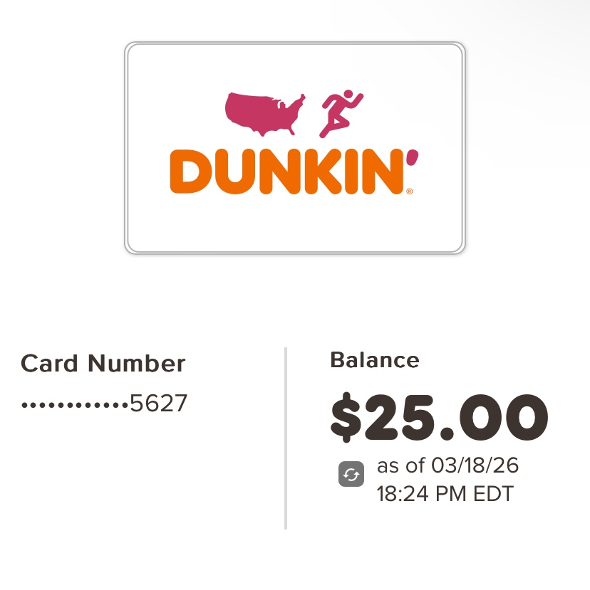 Dunkin Donuts E-gift card can be used in store or on Dunkin app, proof of balance in the covershot I can show proof of balance again before purchase… I have more gift cards for other stores and higher balances just message to see what I have or you can dm on IG imk5ive