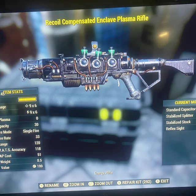 Type: Weapon. Enclave plasma rifle. Max level. Stabilized stock and reflex sight.