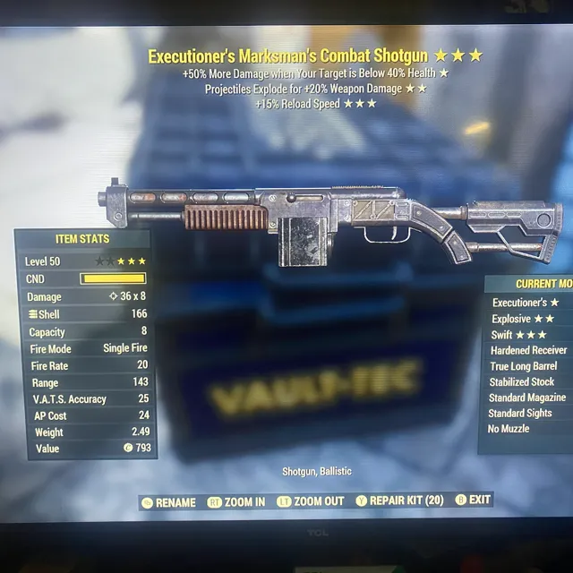 Type: Weapon. Executioners, explosive, fast reload combat shotgun. Max lev
